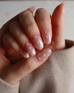 — Soft modern chrome on pink with white polka dots. Made with 100% hard gels.